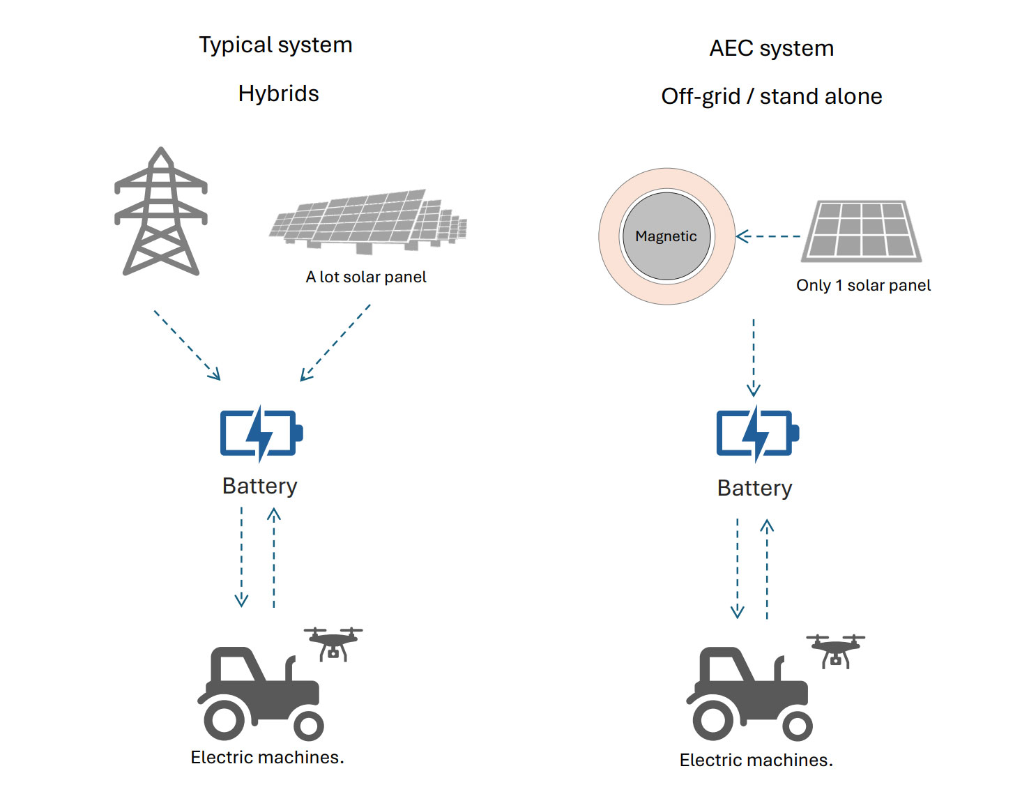 Most farms rely on fossil-fueled machinery. AEC replaces all with magneticpowered machines, eliminating CO₂ emissions from operations entirely.